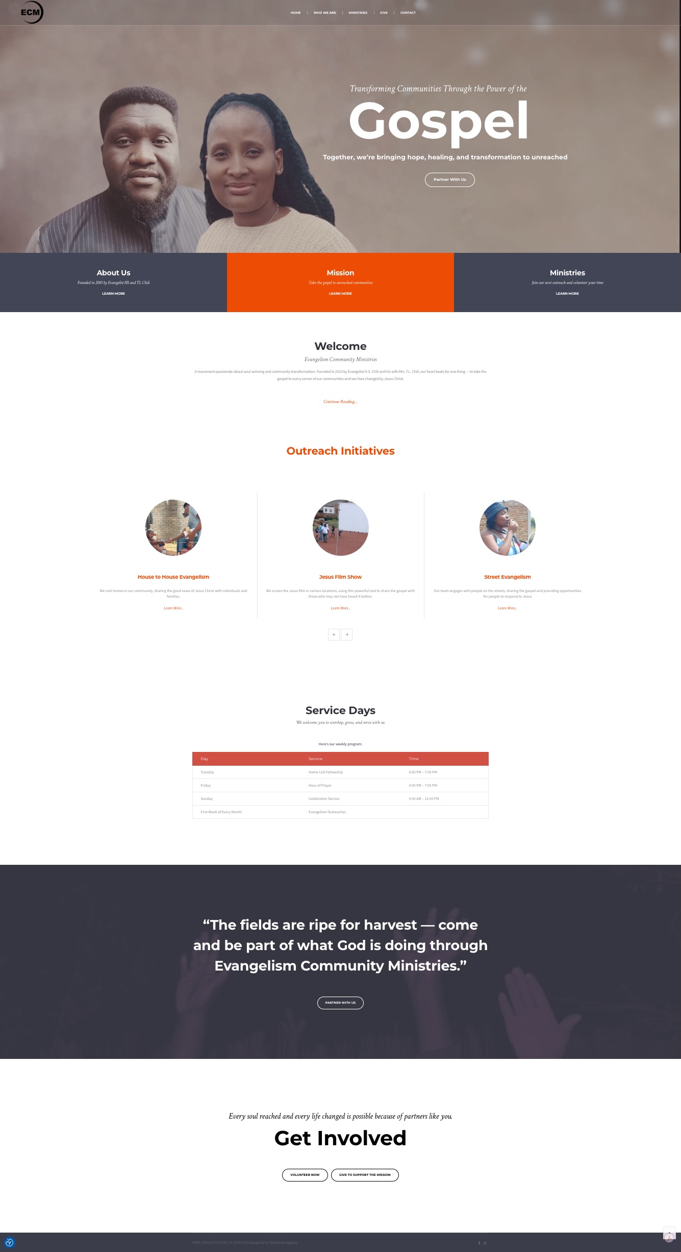 Evangelism Community Ministries is a South African ministry founded in 2010 with a bold mission — taking the gospel to unreached communities through house-to-house evangelism, outreach programs, and community transformation. They needed a website that could clearly communicate who they are, showcase their ministries, attract volunteers, and make it easy for supporters to give online. I built a warm, faith-filled multi-page WordPress site that tells their story powerfully, outlines their ministry arms, and gives donors and partners a simple, trustworthy way to get involved. A site built to serve a mission that goes far beyond the screen.