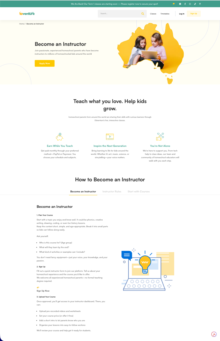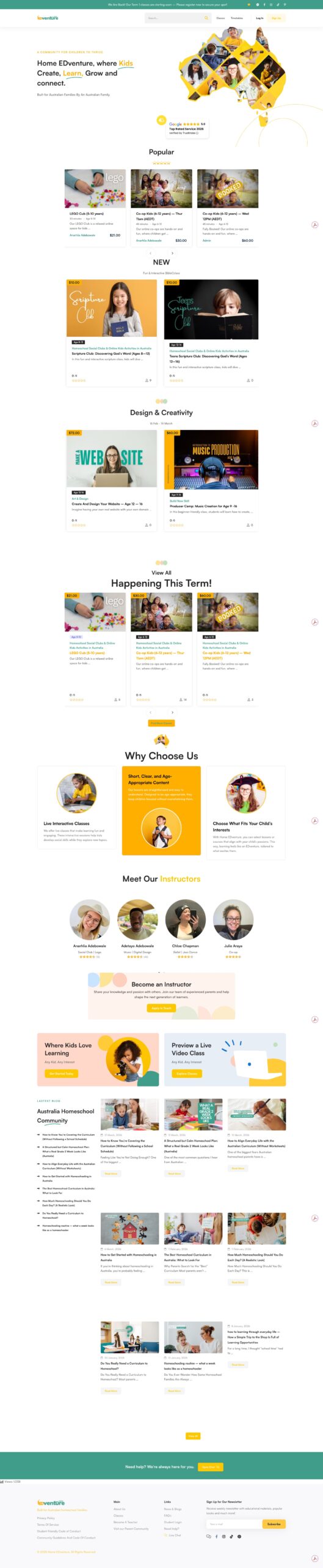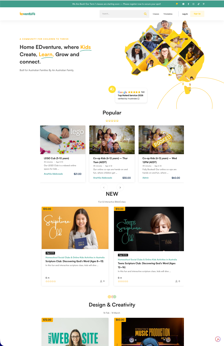 Home EDventure is one of my most personal and technically involved projects. It’s a full online learning platform built specifically for Australian homeschool families, offering live classes, co-ops, and structured programs across science, STEM, geography, music, and more. Fully built on WordPress, the site handles course enrolments, live timetables, student dashboards, and a growing parent community. The design needed to feel fun and welcoming for kids while being easy and trustworthy for parents. The result is a fully functional education platform that serves hundreds of Australian families and continues to grow term by term.